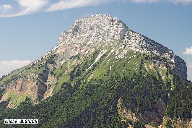 seulement s'ébaucher la charnière de ce pli au nord du sommet, dans les abrupts occidentaux de la butte-témoin des calcaires urgoniens, car tout l'Urgonien du flanc ouest a été enlevé par l'érosion ; par contre, dans les couches plus anciennes de son soubassement boisé, la variation progressive des pendages dessine assez largement la charnière du pli.
