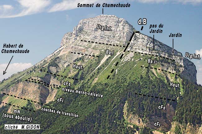 ![]() Le versant oriental de la montagne de Chamechaude, vu de l'est, depuis les pentes de Pravouta Ce versant, le plus raviné, montre bien la succession des strates, ce qui permet de repérer finement les limites des "membres"* successifs que l'on y distingue. d.B = décrochement du Bachasson : ici son rejet dextre occasionne seulement un faible surhaussement du compartiment méridional (celui de gauche) car le mouvement n'était pas vraiment horizontal mais comportait une inclinaison vers l'ouest, d'une valeur assez proche de celle du pendage des couches (voir le schéma ci après). |