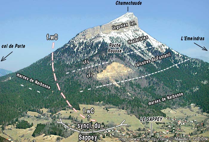 L'analyse des pentes boisées du versant ouest de Chamechaude (voir la page "Col de Porte") suggère qu'elles sont parcourues par une faille ouest de Chamechaude, sub-verticale et à peu près N-S, qui abaisse, du côté est, le contenu du synclinal du Sappey. Cela explique que les marnes de Narbonne affleurent encore dans ces pentes occidentales à l'altitude où s'abaisse la limite entre Hauterivien et calcaires du Fontanil sur l'éperon de Roche Rousse.