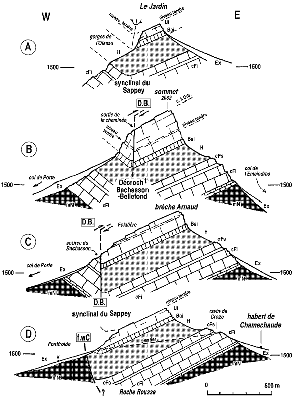 ![]() Coupes successives, traversant du nord au sud le chaînon de Chamechaude. D.B. = décrochement du Bachasson (entre les tracés des coupes C et D il se prolonge vers la gauche et vers la droite entre les tracés B et A) ; f.wC = faille des pentes occidentales de Chamechaude (voir la page "Col de Porte"). |