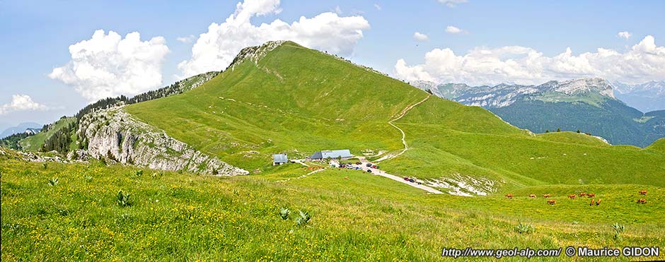 Les chalets d'alpage ("haberts") et le sommet du Charmant Som, vus du SW (bosse cotée 1722). La crête que rejoint le sentier d'accès au sommet correspond à la voûte du repli anticlinal du Charmant Som. Il s'abaisse très visiblement vers le sud, comme le creux du vallon d'alpages, qui correspond lui au repli synclinal des haberts. |