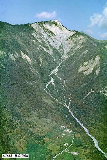 a favorisé ensuite l'éventration du pli par la jeu des ravinements, est sans doute due à