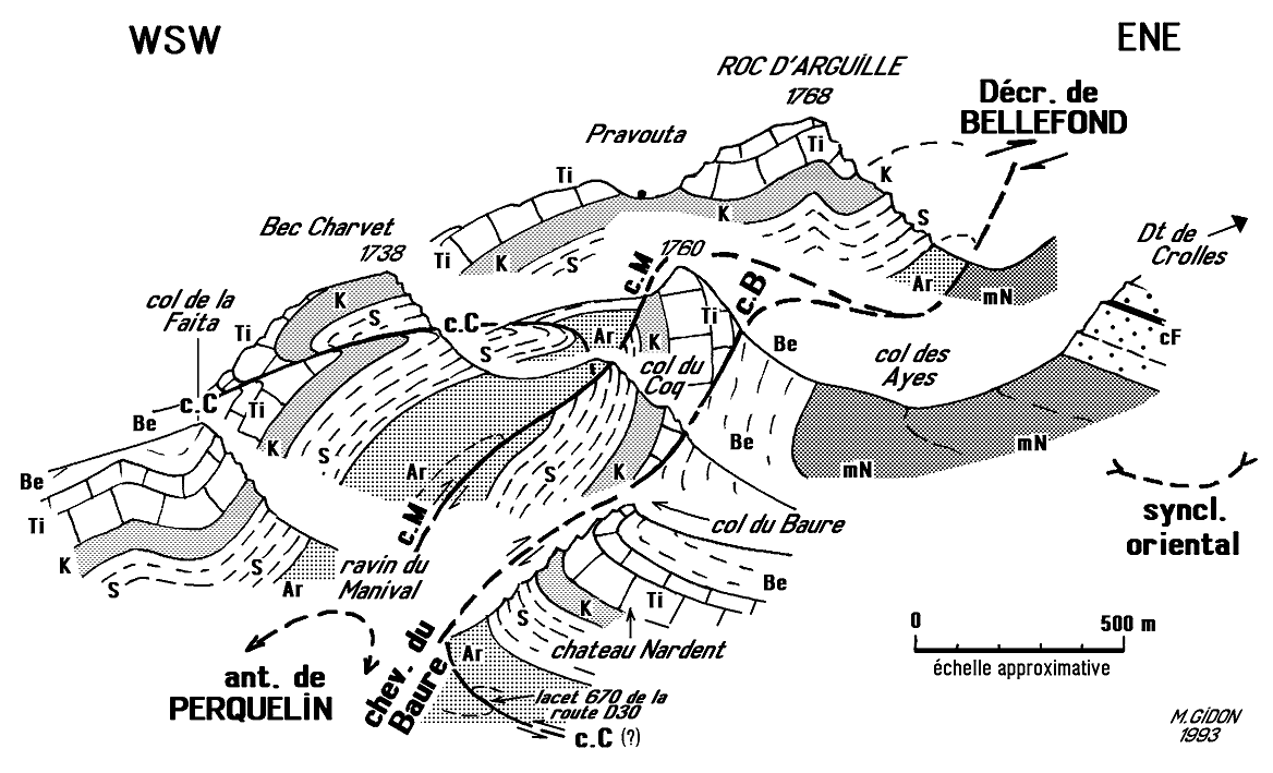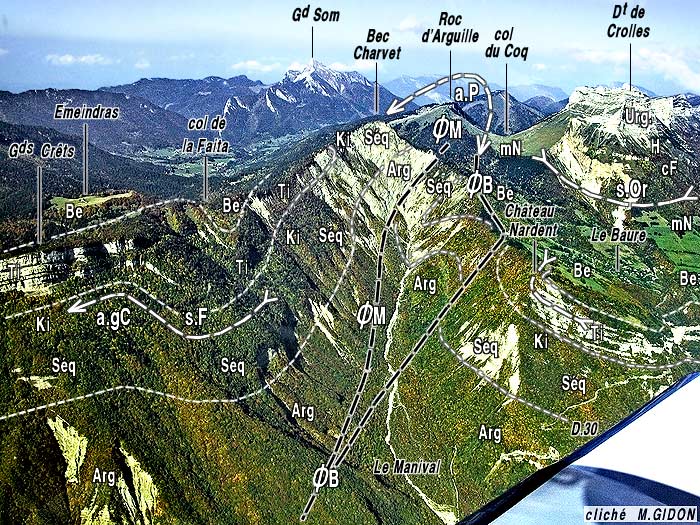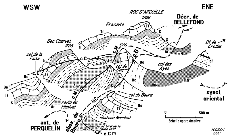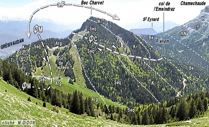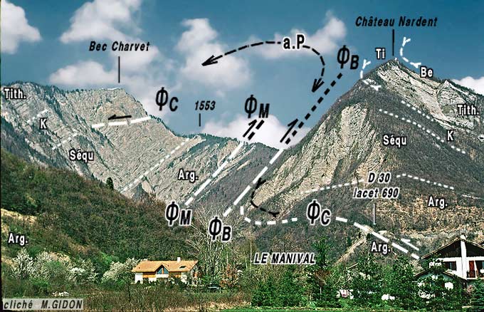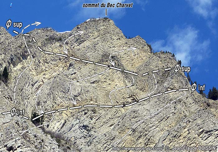 Les ravinements du versant sud-occidental du Bec Charvet permettent de constater que ce chevauchement se partage d'abord en deux surfaces de cassure puis que chacune d'entre elles s'amortit vers l'ouest en se perdant dans une pile de replis fortement déversés vers l'ouest.