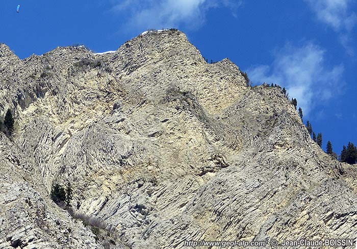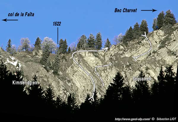 En effet au niveau de la crête, à proximité du col de la Faita, on n'observe plus de rupture des couches mais seulement leur brutal changement de pendage résultant de l'amortissement des surface de chevauchement.
