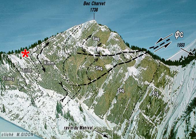 ![]() La face sud du Roc Charvet, vue d'avion (en hiver), du sud, depuis l'aplomb du ravin du Manival. L'entaille du haut ravin du Manival permet de distinguer, particulièrement lorsque la neige souligne les strates, la faille de chevauchement du Bec Charvet (ØC), qui se dédouble et s'amortit vers l'ouest (l'astérisque rouge localise le détail représenté sur le second des deux clichés suivants). Les crochons* indiquent clairement le sens du mouvement (demi flèches), qui est celui d'une faille de raccourcissement (faille compressive, "inverse"). Compte tenu du pendage de la cassure le compartiment supérieur s'abaisse vers l'ouest sous l'effet de ce rejet, ce qui est la disposition inverse de celle que l'on observe dans ce type de faille : il s'agit donc nécessairement d'une cassure antérieure au plissement, qui a été basculée vers l'ouest, avec le flanc ouest de l'anticlinal de Perquelin, dans lequel elle s'inscrit (cette structure est très comparable à celle du Jalla). |