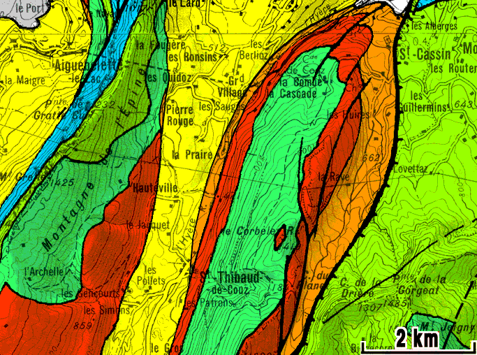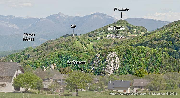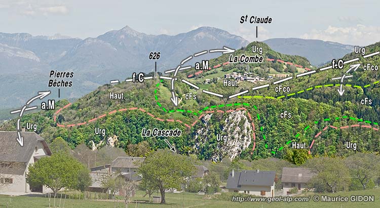 Toutefois celle-ci est accidentée par la faille de La Combe, dont le tracé sensiblement N-S introduit un décalage dextre des contours stratigraphiques. Cela est dû au fait que cette cassure abaisse en fait la moitié orientale de l'anticlinal, à l'Urgonien de laquelle appartient la butte des ruines de Saint-Claude. Un peu plus au nord, dans les gorges du torrent du Merdarel au nord-ouest de Saint-Cassin (voir cliché en haut de page), des couches oligocènes cachettent cette faille, ce qui montre qu'elle a, pour l'essentiel, fonctionné au cours de leur dépôt. Cette faille se connecte vers le sud à la faille du col du Mollard, dont le tracé passe en contrebas oriental de la butte du château Saint-Claude. |