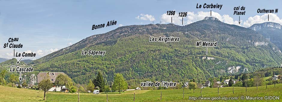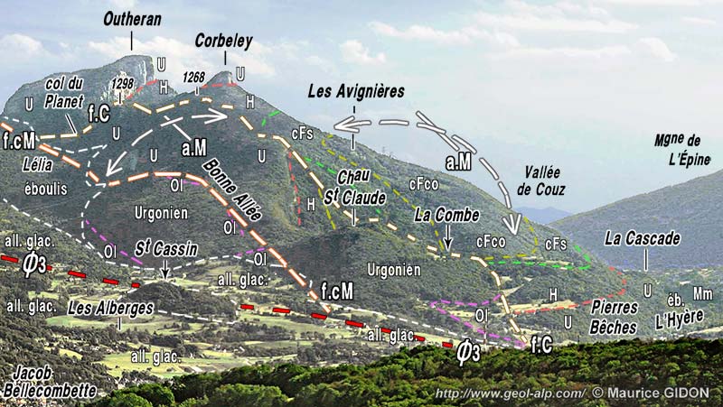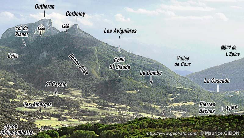En définitive l'échine de la montagne du Corbeley s'abaisse de plus en plus vers le nord, jusqu'à s'effacer, à l'est de Vimines, dans les collines du pourtour de la dépression alluviale de Chambéry (voir le premier cliché de la page). Ceci résulte d'un relief presque "conforme", qui suit à peu de chose près l'abaissement, depuis l'Outheran jusqu'à Saint-Cassin, de la voûte urgonienne de l'anticlinal de la Chartreuse médiane. Mais il faut observer que si le chaînon de l'Outheran finit par s'effacer à la latitude de Vimines et de Saint-Cassin ce n'est pas que le pli s'amortisse, puisque sa voûte urgonienne y est toujours bien dessinée : en fait il s'ennoie simplement là sous le remplissage miocène de la dépression synclinale du lac du Bourget.