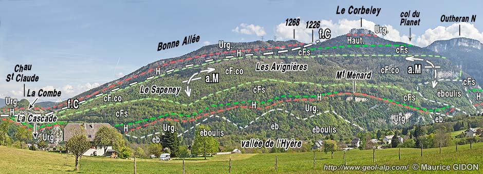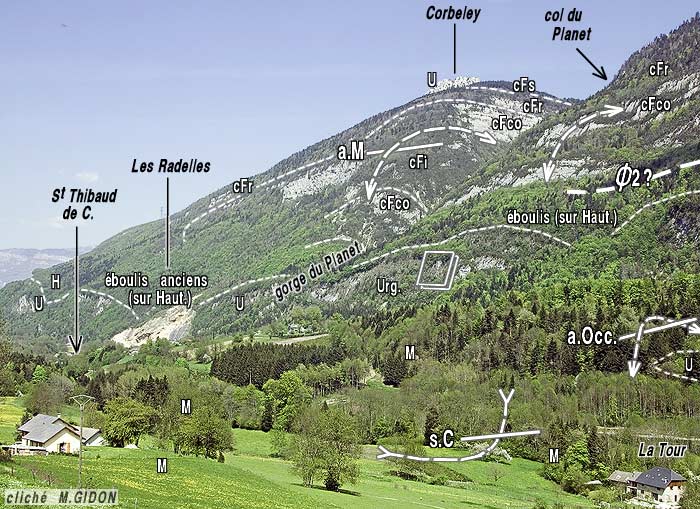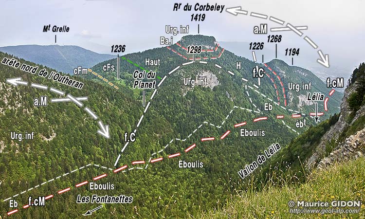 ![]() Le versant est du Corbeley, vu du sud-est, depuis les crêtes, entre le col des Fontanettes et le Mont Pellaz. Les prairies du col du Planet sont installées sur les calcaires du Fontanil supérieurs de la voûte de l'anticlinal médian : ces couches butent du côté est contre l'épaulement d'Urgonien du col lui-même, par la faille de La Combe (f.C), qui se connecte à la faille du Col du Mollard (f.cM) au sud du col du Planet. Les symboles de charnière désigne l'incurvation des couches par laquelle on passe de la voûte de l'anticlinal médian à son flanc oriental (la charnière occidentale du pli n'est pas visible ici, car elle se situe sur le versant opposé de la montagne). |