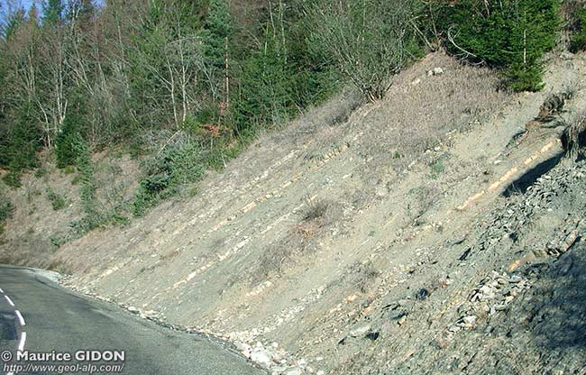 La pente topographique est conforme à celle des bancs (vus par la tranche en arrière-plan) qui se dénudent en dalles structurales (angle inférieur droit du cliché). Ce pendage, beaucoup plus modeste qu'aux abords de la gorge de la Vence, indique que l'on est moins loin, ici, de la charnière anticlinale (elle passe tout de même presque1 km plus à l'est). Outre le ravinement qui tend à combler les fossés de débris (où l'on observe les fossiles du cliché suivant) cette disposition favorise le glissement en masse du soubassement de la route (dont les murs de soutènement montrent de nets indices). |