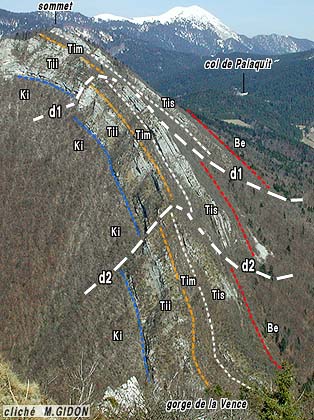 L'Écoutoux : détail du flanc oriental Le flanc est de l'anticlinal est affecté de deux failles de décrochement qui sont mises en évidence par un examen attentif de la manière dont se poursuivent les différents niveaux (Tis, Tim, Tii) que l'on peut y distinguer dans le Tithonique. Elles représentent, selon toutes apparences, le prolongement du décrochement du Pas de la Branche, qui décale la corniche tithonique du flanc oriental du synclinal du Sappey. Ces cassures sont verticales et transversales à la crête qui descend depuis le sommet vers la gorge de la Vence. Leur tracé, qui serait rectiligne en vue zénitale, décrit donc une inflexion pour franchir la crête, si on l'observe selon un axe horizontal, comme c'est le cas sur ce cliché. Replacer ce détail