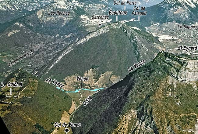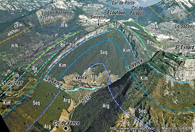 Le sommet de l'Écoutoux (1406 m.) est une éminence secondaire dont l'échine descend doucement vers le nord mais dont le versant sud tombe abruptement sur le thalweg du torrent de Vence. Ce dernier en donne une coupe naturelle qui montre que le Tithonique dessine un splendide anticlinal. Cet anticlinal de l'Écoutoux, qui est ainsi tranché de façon pratiquement orthogonale, est l'anticlinal le plus occidental du domaine de la Chartreuse orientale ; c'est un pli majeur si l'on considère son ampleur mais aussi sa grande continuité vers le nord (plus difficile à mettre en évidence toutefois du fait que sa voûte est difficile à localiser lorsque elle affecte les couches supérieures à la barre tithonique).