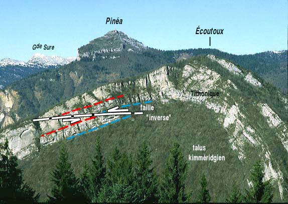 Détail du sommet de L'Écoutoux vu du sud, depuis le Saint-Eynard. Le flanc ouest de l'anticlinal est affecté d'une faille compressive (= faille "inverse") antérieure au plissement (de la même famille que celle du Jalla) : pour matérialiser le décalage on a encadré la corniche inférieure du Tithonique de tirets roges à son sommet et bleus à sa base. |