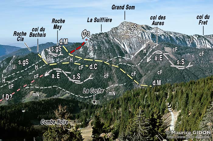 ![]() Le versant sud-ouest du Grand Som, vu du sud-ouest, depuis le sommet du Charmant Som. a.M = anticlinal médian ("du couvent") ; d.B = décrochement de Bovinant ; d.RM = décrochement de la Roche May (prolongement vers le sud-ouest de celui du col de l'Alpe) ; drC = décrochement satellite de Roche Cla. Des commentaires géologiques complémentaires sont donnés sur le panorama On trouvera des vues plus détaillées sur les abords du sommet du Grand Som à la page qui lui est spécialement consacrée. |