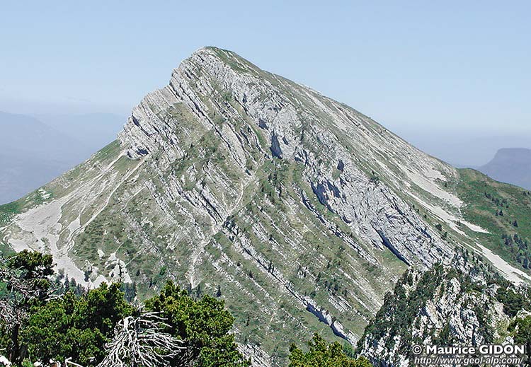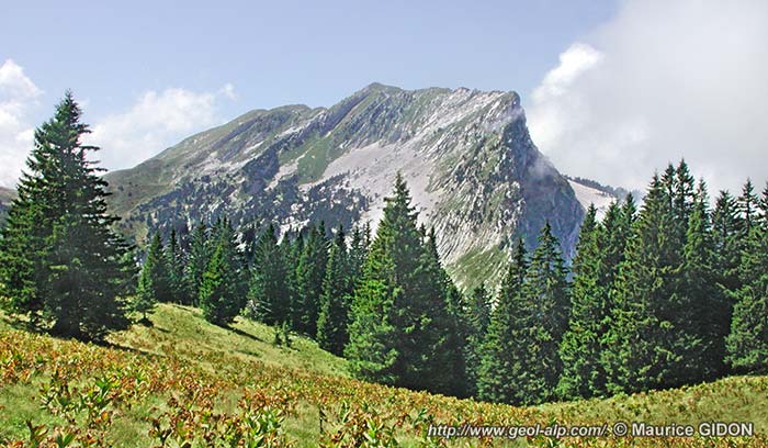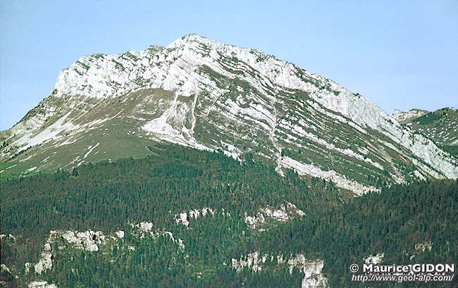 Les abrupts sommitaux mettent bien en évidence la répartition des faciès plus ou moins calcaires (bioclastiques)* ou marno-calcaires qui constituent là les calcaires du Fontanil inférieurs (formation de la Rivoire) et la partie supérieure de la formation du Chevalon (voir la page "Le Fontanil"). Au voisinage de la crête sommitale les calcaires du Fontanil inférieurs forment une barre plus puissante car formée de faciès massifs, à rudistes, très proches de ceux qui sont communs dans l'Urgonien (et qui traduisent un environnement de dépôt subrécifal).