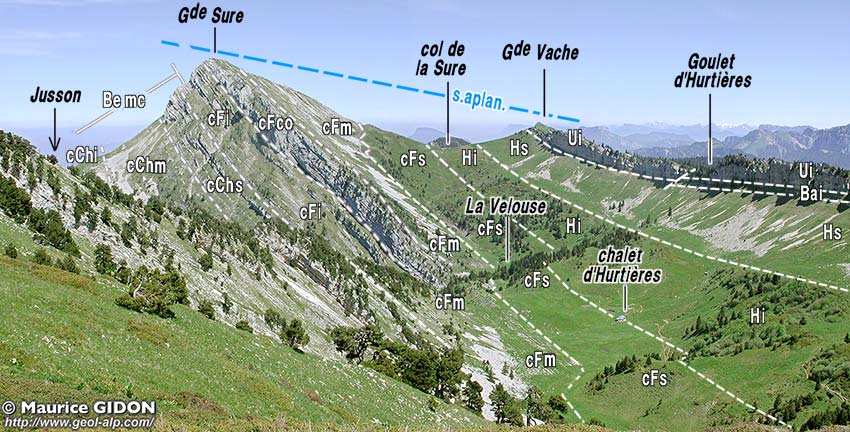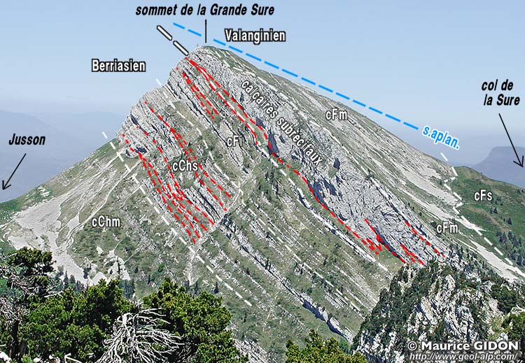 Les couches calcaires de la Sure (en grande partie à faciès "calcaires du Fontanil") peuvent être réparties entre 3 niveaux (pour les dénominations ci-après se reporter à la coupe de référence du Fontanil) : cFs = calcaires supérieurs ("à silex") brunâtres et à lits marneux ; cFm = partie moyenne des calcaires du Fontanil (= membres de la Rivoire et de Valetière) ; on peut y distinguer un niveau plus massif de calcaires francs à patine claire plus ou moins corraligènes qui est noté ici cFCo ; cFi = calcaires bioclastiques et argileux alternés en lits d'épaisseur irrégulière : ils correspondent apparemment à la base du membre de Valetière et à la partie supérieure de la formation du Chevalon (cChs= membre des Oullières). Au pied des escarpements occidentaux de la Grande Sure affleure la formation du Chevalon moyenne (membre du Peuil), à marnes et marno-calcaires prédominants (notée cChm) puis les marnes et calcaires argileux du Berriasien inférieur (membre de Sautaret, noté cChi). Du point de vue chronologique cFs et cFm se rattachent à l'étage Valanginien ; cChs, cChm et cChi se rattachent à l'étage Berriasien et appartiennent à l'ensemble noté Be.mc dans divers autres secteurs de la Chartreuse. |