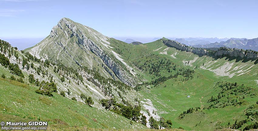 Ce trait du relief concerne les pentes au sud du sommet ou, celles, plus au nord, qui tombent sur le ravin supérieur de Chorolant. Par contre entre le sommet proprement dit et son antécime nord (point 1896), il n'y a pas de vraie crête mais plutôt une large échine plutôt mamelonnée, percée de grandes dolines, typique d'un relief karstique. Il s'agit sans doute là d'un panneau résiduel du relief ancien, hérité de l'épisode d'aplanissement, préliminaire au creusement des vallées et au dégagement des crêtes, qui est évoqué plus haut. |