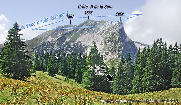 Le profil de la crête au nord du sommet jusqu'au point 1853, c'est-à-dire sur plus de 1 km (cliché ci-dessus) se singularise par le fait que son altitude reste sensiblement la même : cela s'interprète de façon très satisfaisante en considérant qu'il s'agit là d'un tronçon de l'ancienne ligne d'intersection des couches par la vieille surface d'aplanissement qui n'a pratiquement pas été rabaissé par les encoches qu'y ont pratiqué plus au nord (Cul de Lampe) et plus au sud (La Velouse) les attaques d'érosion remontante des têtes de ravins du versant ouest.