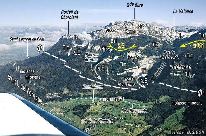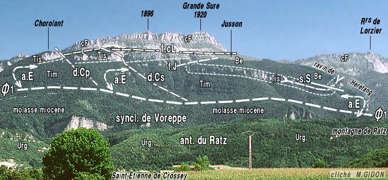 ![]() La façade nord-ouest de la Grande Sure, vu de la vallée de Saint-Nicolas de Macherin (c'est sous cet angle que l'on distingue le mieux les rapports entre les divers accidents mineurs de ce versant de la montagne). d.Cp = décrochement du Portail de Chorolant ; d.Cs = décrochement sud de Chorolant ; f.cL = faille du Cul de Lampe ; f.J = faille (de chevauchement) de Jusson ; s.S = synclinal transverse de la Sure** ; a.E = anticlinal des Égaux. N.B. On remarque que, sous Jusson, la barre du Tithonique supérieur descend assez bas dans le versant, avant de remonter en rive nord du ravin de l'Hérétang. Ceci correspond au fait que le synclinal transverse de la Sure s'entrecroise là avec la voûte de l'anticlinal des Égaux, ce qui a pour effet de faire basculer vers l'ouest l'axe du premier de ces deux plis. ** voir la page "Chartreuse occidentale". |