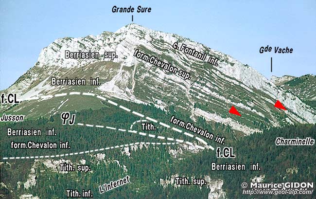 ![]() Le versant occidental des pentes sommitales de la Grande Sure, vu du sud-ouest, depuis le Pas du Mortier f.CL = faille du Cul de Lampe ; La formation du Chevalon est d'âge Berriasien et correspond sensiblement à l'ensemble noté Be.mc dans les secteurs plus orientaux de la Chartreuse. Le faciès "calcaires du Fontanil" tend à occuper de plus en plus de place vers le bas de la succession en allant du sud vers le nord dans ce chaînon. Dans le détail on voit ici que les bancs les plus massifs des calcaires du Fontanil s'épaississent vers la gauche (ouest), où ils deviennent coalescents. Ils s'effilochent au contraire vers la droite entre des niveaux plus argilo-calcaires, garnis d'herbe, dans le sens indiqué par la flèche rouge. Cela est dû à ce que le dépôt de ces couches étaient alimenté par des écoulements de sables (formés de débris de coquilles) qui provenaient de l'ouest (du rebord de la plate-forme jurassienne). |