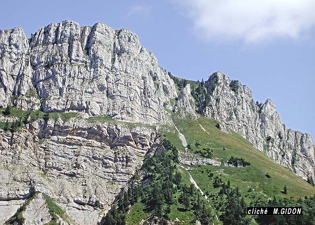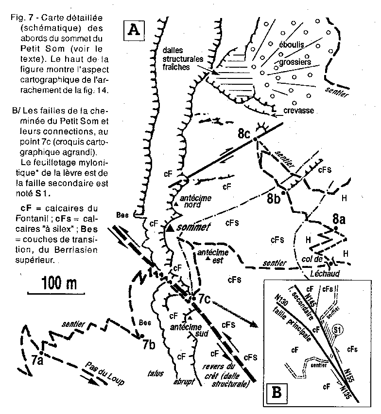 ![]() Le versant ouest du Petit Som (détail des abords du sommet), vu de l'ouest - nord-ouest, depuis le Tracol (crête nord de l'Aliénard). On a souligné, avec des tirets de couleur, deux niveaux repères qui permettent d'apprécier le rejet vertical induit dans l'entaille de la falaise par le décrochement D. Le décrochement se dédouble en deux cassures, faille principale à droite et faille secondaire à gauche (cf détail agrandi de la carte), encadrant une navette*. Ces niveaux correspondent respectivement : en bleu, à la base du membre des Oullières (partie haute de la formation du Chevalon = Berriasien supérieur) ; en rouge, à la base du membre de Valetière - La Rivoire (calcaires du Fontanil inférieurs = Berriasien terminal - Valanginien inférieur). |