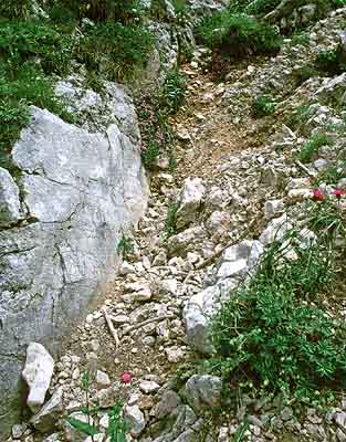 Le sentier qui l'emprunte permet de faire ainsi des observations intéressantes sur l'anatomie des failles de ce type. On en trouvera ci-après plusieurs photos (successivement de haut en bas du couloir) :