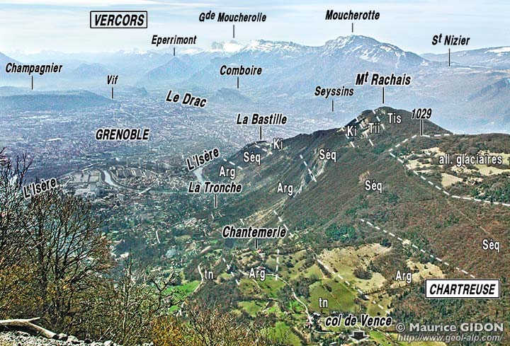 Mais son escarpement oriental est peu marqué car les bancs les plus massifs du Tithonique supérieur n'affleurent en général que dans le versant ouest, sans parvenir à atteindre la crête, et seuls les bancs du Tithonique inférieur arment le haut du versant oriental. Cela vient de ce que, sur la transversale à cette crête, le Tithonique de la charnière du pli et du haut de son flanc occidental ont été totalement enlevés par l'érosion (l'axe de l'anticlinal passe plus à l'est, à peu près par Corenc et Montfleury, comme l'indique la coupe simplifiée ci-dessus).