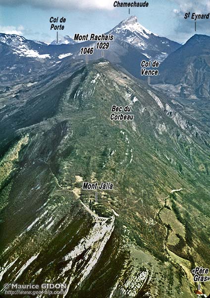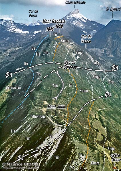 La route forestière du Jalla s'élève, depuis la plateforme de la Bastille à côté du "restaurant du Père Gras", jusqu'à son premier lacet, dans les calcaires en petits bancs alternés de lits marneux du Kimméridgien. Les deux lacets suivants recoupent les couches à bancs calcaires plus épais du Kimméridgien supérieur, puis les gros bancs du Tithonique inférieur, redoublés par le chevauchement du Jalla au dernier lacet. Depuis son sommet un ancien chemin d'exploitation mène au village de Mas Cachet. Il rejoint d'abord, par 500 mètres de trajet horizontal et en partie en encorbellement, l'entrée d'anciennes exploitations où l'on voit les calcaires à ciment naturel du Berriasien basal reposer sur le "hard-ground" du sommet du Tithonique. Le chemin qui s'élève en direction du Mont Rachais, depuis le large col boisé du Jalla, décrit d'abord une succession de lacets qui s'inscrivent essentiellement dans les calcaires en petits lits (souvent de moins de 10 centimètres d'épaisseur) du Tithonique moyen. Il laisse sur sa droite les gros bancs du Tithonique inférieur qui forment le rognon du Bec du Corbeau. Il franchit ces derniers au replat d'altitude 750 et s'élève ensuite dans les bancs du Kimméridgien supérieur qui sont là redressés à la verticale (voire légèrement renversés vers l'ouest) : ce mouvement des couches correspond au crochon induit par le chevauchement du Rachais qui traverse l'échine (mais y est masqué par des éboulis) vers l'altitude de 820. |