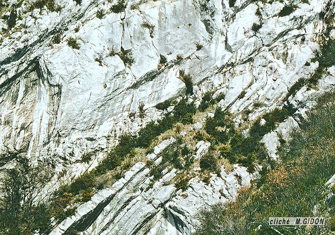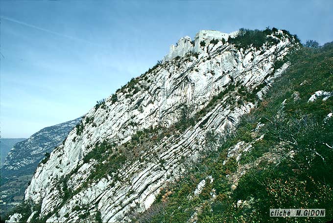 Le ressaut rocheux qui domine les pentes situées à l'ouest de la plateforme de La Bastille montre, avec une belle clarté (due à ce que sa coupe naturelle est presque orthogonale aux couches), le passage d'une faille qui recoupe les couches du Tithonique avec une faible obliquité (c'est-à-dire selon une valeur angulaire typique des failles compressives).