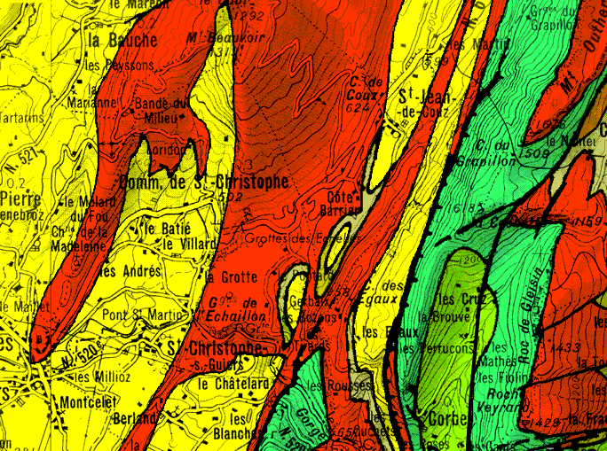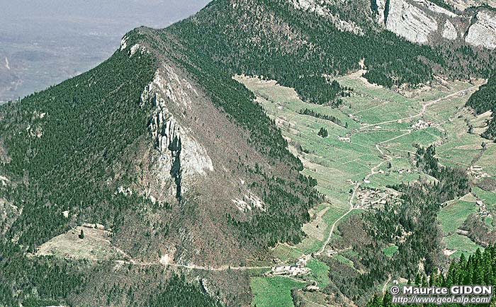 Ces mêmes traits de la géométrie de ce pli s'observent également plus au sud, au niveau de la coupe du Guiers Mort (voir la page "Chartroussette ouest"). Par contre au nord, à partir des pentes de l'Outheran et vers le sud à partir du col de la Charmette cet étirement du flanc ouest de l'anticlinal cesse pour faire place à un flanc de pli simplement vertical traduisant le fait que ce pli est déjeté vers l'ouest, mais non rompu. |