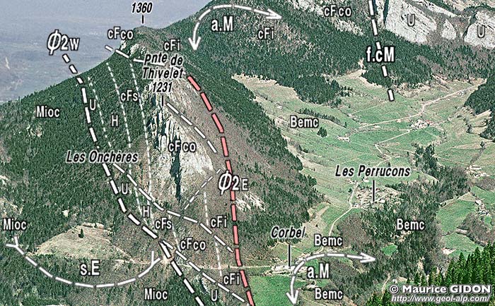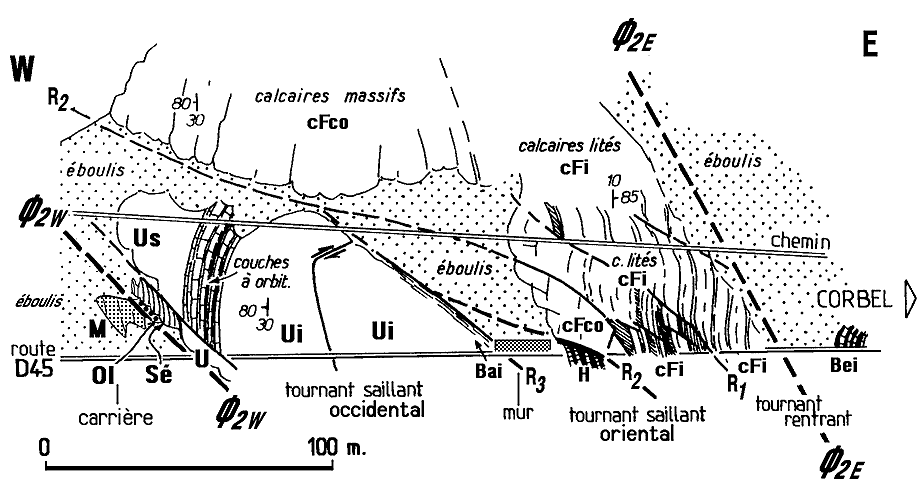 ![]() même fenêtre Coupe de détail du flanc occidental de l'anticlinal médian donnée par les tournants en encorbellement de la D45, à l'ouest de Corbel. Ø2E = faille orientale du chevauchement de la Chartreuse médiane ; Ø2W = faille occidentale. Les cassures notées R1, R2, R3 sont des cassures mineures, de la même famille que celles notées R sur les clichés et sur le schéma d'ensemble ci-dessus. NB : le développement de la végétation et le glissement de matériel ébouleux font que, depuis 2006, la partie la plus occidentale de cette coupe (dans la carrière) est devenue partiellement masquée : un faible déblaiement par quelques coups de pelle mécanique permettrait de l'observer de nouveau.. |