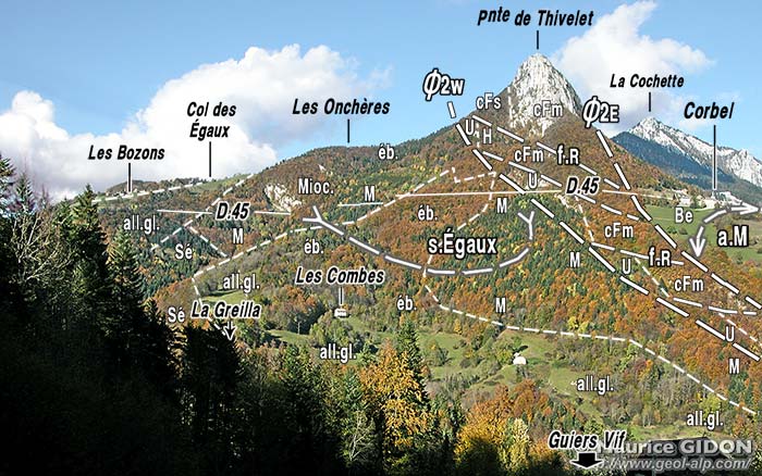 ![]() La crête de Thivelet, vue du sud, depuis le sommet du Petit Som. Cette vue lointaine et légèrement plongeante restitue une perspective qui montre mieux la place de ce petit sommet dans son environnement. a.M = anticlinal médian ; f.cM = faille du Col du Mollard ; s.E = synclinal des Égaux ; Ø2E = chevauchement de la Chartreuse médiane (cassure orientale) ; Ø2W = chevauchement de la Chartreuse médiane (cassure occidentale). On a représenté sans les nommer les principales cassures qui découpent leur bande rocheuse intercalaire, notamment les failles "R" du schéma ci-dessus. |