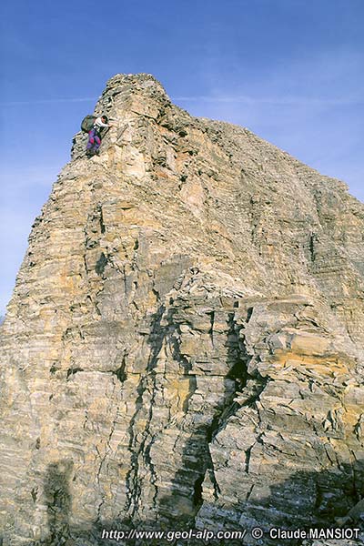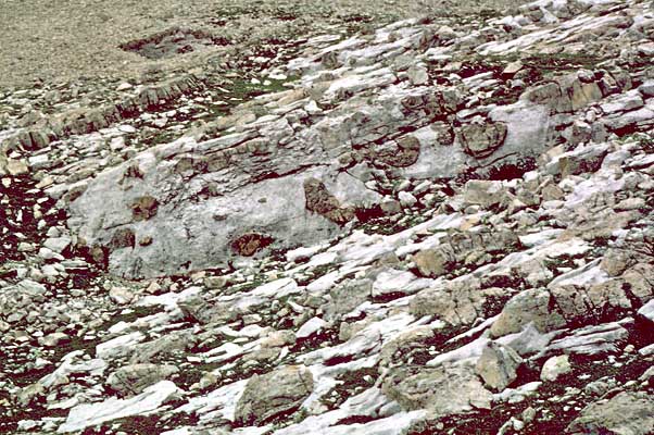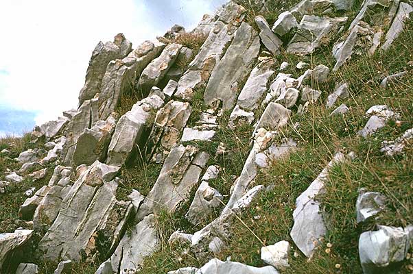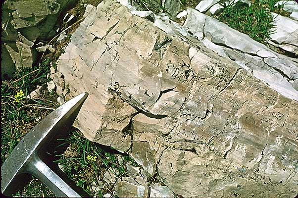 Lauzes rubanées (Campanien-Maestrichtien). Succession très monotone de petits bancs, de 20 à 30 cm d'épaisseur, de calcaires gris clair à pâte assez fine, dotés d'un fin litage siliceux parallèle aux bancs, surtout net dans la partie basse de la formation en Dévoluy occidental. Ce litage s'efface plus haut par développement, dans toute la partie médiane du banc (sur la moitié ou les 2/3 de son épaisseur), d'un lit de cherts plus ou moins siliceux à patine beige; les bancs à cherts sont espacés de 0,5 à 3 m et les lits de cherts eux-mêmes plus ou moins continus ou amygdalaires, montrent des surfaces à ondulations cérébroïdes de 5 à 30 cm de dimension.