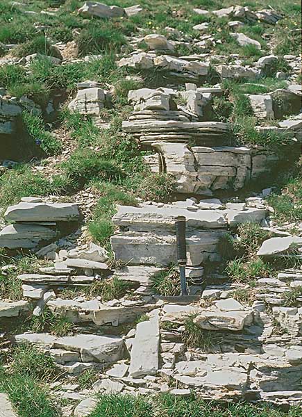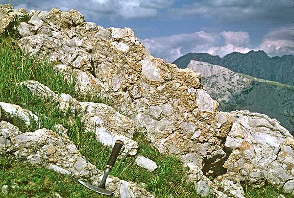 Lauzes à joints jaunes (Maestrichtien supérieur). Le sommet des calcaires sénoniens montre très généralement un faciès (peut-être diachrone d'ailleurs) de calcaires presque totalement dépourvus de silex, à pâte en général plus lithographique et plus claire (mais admettant des passées calcarénitiques plus sombres); le trait le plus caractéristique est que les bancs, épais de 30 cm en moyenne, sont dotés de joints siliceux a patine jaune qui apparaissent dans la majorité des cas comme constitués par un réseau de tubes de quelques millimètres de diamètre attribuables à des bioturbations.