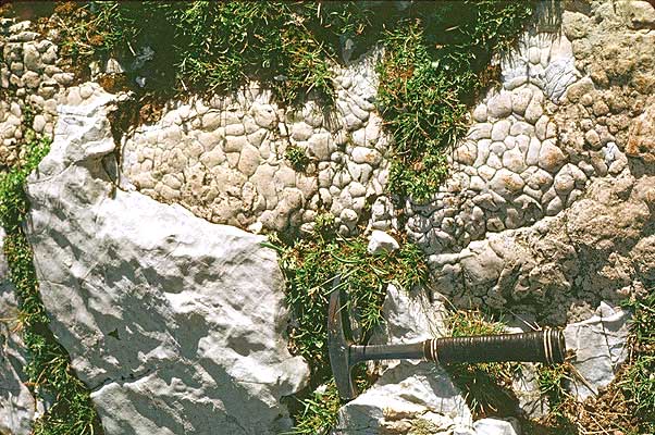 Poudingues et brèches à ciment siliceux et à Microcodium (Maestrichtien?). Des lentilles conglomératiques à éléments calcaires décimétriques plus ou moins mal arrondis (formés de calcaires sénoniens), très comparables à certaines passées observées au sein des calcaires c7c (et incluant des récurrences de ces derniers) se développent localement de fac,on notable et reposent en discordance sur les termes inférieurs. Le ciment de ces poudingues possède un aspect scoriacé et une patine ocreuse et reste en saillie par dissolution; il est souvent siliceux mais parfois calcaire et indistinct des galets en cassure; dans certains cas (extrémité sud de la montagne de Gicon: les Près de l'Aup) il possède une nette texture de Microcodium.