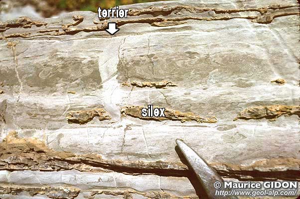 Lauzes à silex (Maestrichtien inférieur). Bien qu'elle admette des passées plus ou moins épaisses de faciès rubanés identiques aux précédents, cette formation est constituée dans sa majeure partie par des calcaires gris clair, régulièrement lités en bancs de 20 à 30 cm, où les silex véritables sont fréquents et non accidentels. Le calcaire a une pâte en général grise, plus ou moins claire et assez fine, avec toutefois des zones plus riches en grains de quartz; les convolute-laminations, terriers et autres figures de bioturbation y sont abondantes dans certains lits.