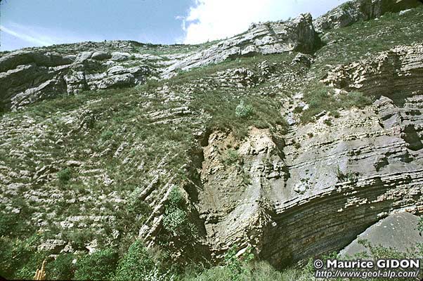 Ce litage oblique résulte sans doute de glissements sous-marins synsédimentaires, car de telles figures sédimentaires s'observent occasionnellement dans une ambiance de "slumping" : voir notamment le niveau inférieur du second cliché de la page "Hauterivien".
