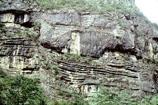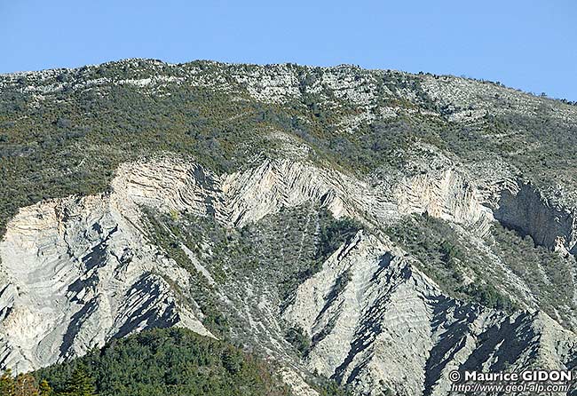 Ici la barre calcaire du Jurassique supérieur est assez épaisse (plus de 200 m) et l'on distingue assez bien le niveau kimméridgien par la vire boisée qu'il détermine.