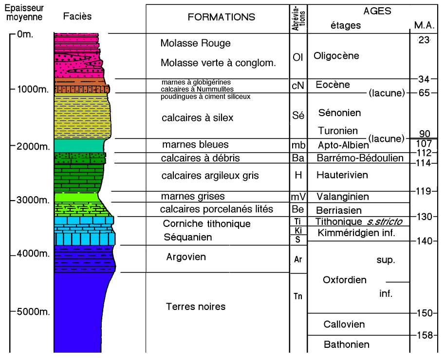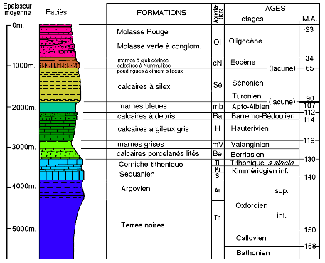 Seuls sont décrits dans cette page les terrains propres au Dévoluy, du Tertiaire au Crétacé inférieur inclus. (voir aussi la liste des formations donnant leurs abréviations sur les figures) |