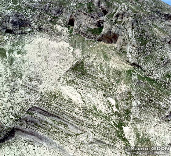 Kink-band décamétrique, dans les abrupts méridionaux de la crête de Barge, vu du sud d'avion.