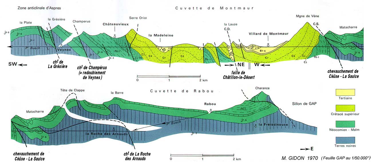 - Les chevauchements de Charance, de la Tête de la Clappe et des Teyssonières (vallon de Matacharre), que l'on observe en rive septentrionale de la trouée de La Freyssinouse, sont déversés vers le SW. Ils paraissent associés (au moins par leur orientation) au plissement d'axe NW-SE (anticlinal de Bure et synclinal de Saint-Etienne) qui affecte la dalle sénonienne et évidemment aussi le soubassement anté sénonien (bien que son effet y soit moins facile à observer). Ils sont donc sans doute post-Sénoniens eux aussi. Mais leur surface de chevauchement est reployée par des plis N-S qui traduisent l'intervention d'une étape plus tardive de plissement post-Sénonien.