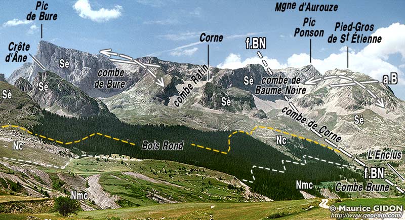 Ceci s'observe de l'Obiou au col du Festre, ainsi que sur le revers oriental du chaînon de Bure - Aurouze (ces crêtes ressemblent beaucoup, en cela, au versant occidental de la chaîne des Aravis et au massif suisse des Churfirsten).