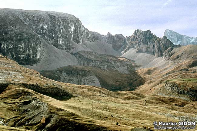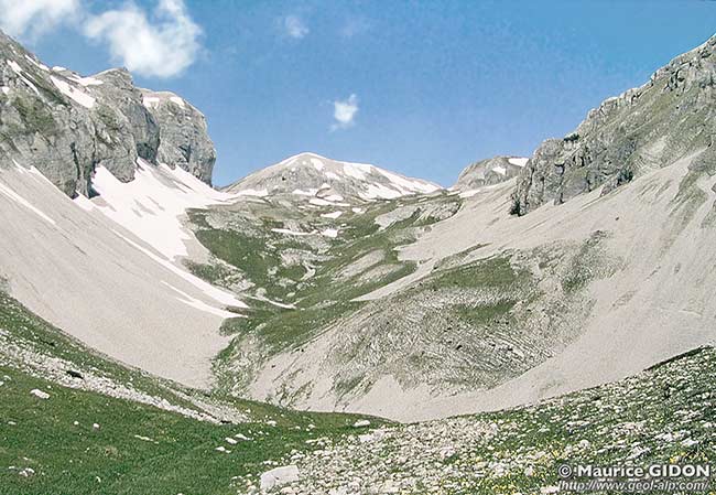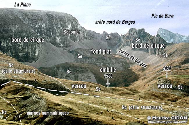 Un des traits qui caractérise les versants orientaux des hauteurs du Dévoluy est que la chape sénonienne y est entaillée de vallons en forme de coup de gouge, à flancs abrupts et à fond rocheux large et presque plat. Plusieurs d'entre eux (surtout au revers est du plateau de Bure) sont en outre fermés à l'amont, en cirque, par une muraille plus ou moins continue.
