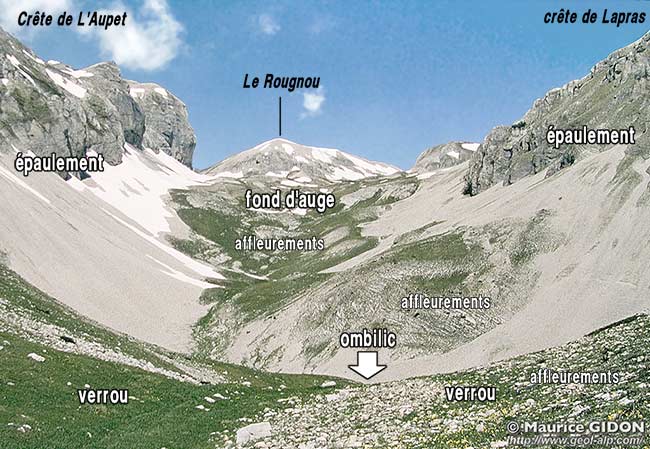 Observer que le fond plat de l'auge est bel et bien sculpté dans la roche et qu'il ne résulte pas d'un colmatage par des alluvions fluviatiles, à l'opposé de ce qui a lieu dans nombre d'autres vallées, qui ont été empruntées par des rivières après la fonte du glacier.