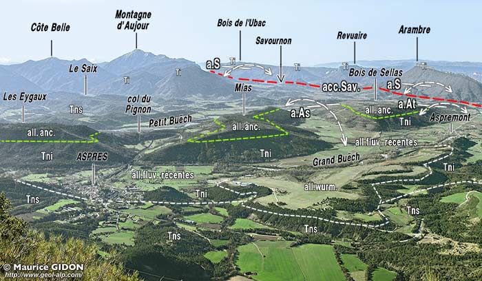 ![]() La bordure occidentale de la dépression d'Aspres vue du nord-est, depuis l'extrémité sud-est de la crête de la Longeagne (abords du col de Marjariès) a.At = anticlinal NW-SE d'Aspremont : le cœur du pli est formé par les Terres Noires inférieures (Callovien à Bathonien) et sa voûte s'enfonce vers le NW (vers la droite) ; acc. Sav = accident de Savournon : grande cassure NW-SE qui sectionne le flanc ouest de l'anticlinal d'Aspremont. Elle est bordée du côté sud-ouest par des replis d'axes à peu près parallèles à la faille ; a.D = anticlinal W-E du Duffre : il est tranché par l'accident de Savournon mais le Tithonique de son flanc sud se poursuit vers le sud-est (vers la gauche) au prix d'une torsion de sens horaire (dextre) autour d'une charnière passant par le sommet de la montagne d'Agnielle (voir la page "Savournon"). |