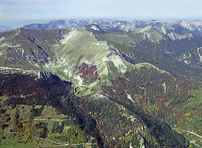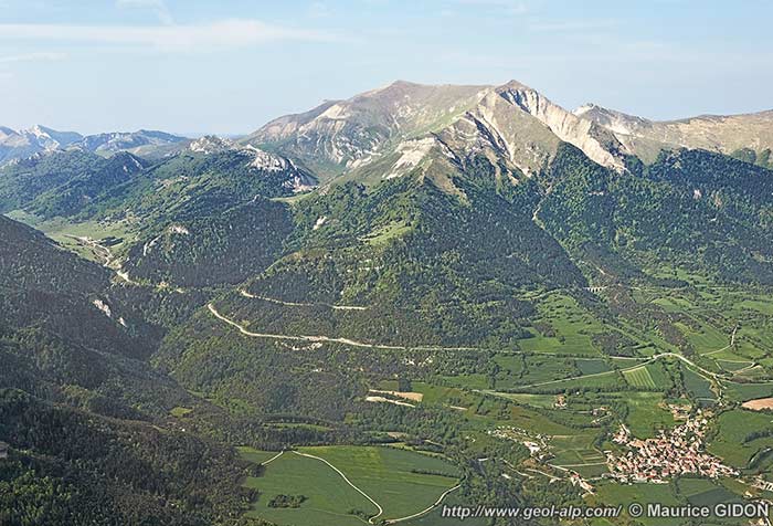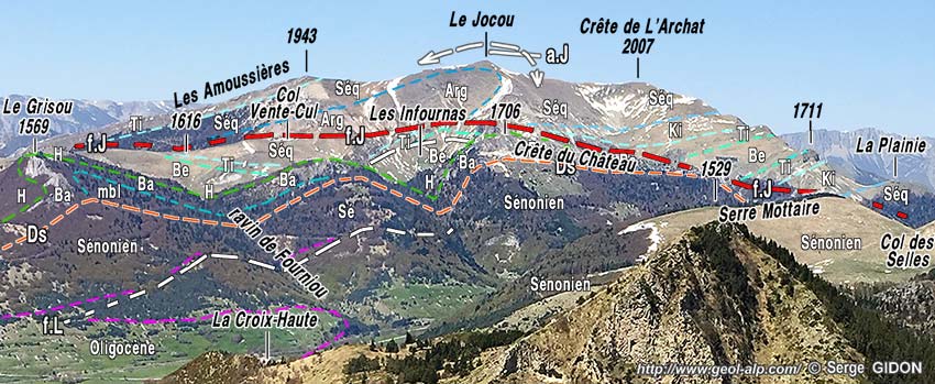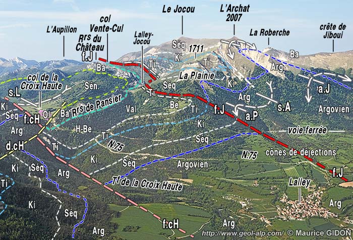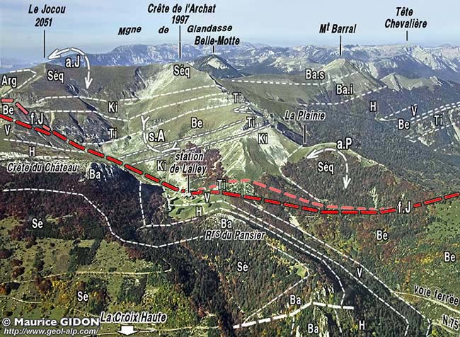 ![]() Le versant septentrional du col de la Croix-Haute, vu d'avion, du NE depuis l'aplomb du village d'Avers. f.cH = faille de la Croix Haute (voir la page "Rognon") ; d.cH = décrochement de la Croix Haute ; f.J = faille du Jocou ; s.L = synclinal de Lus ; a.P = anticlinal de La Plainie ; s.A = synclinal de l'Archat ; a.J = anticlinal du Jocou. |