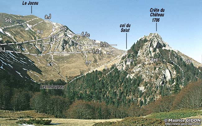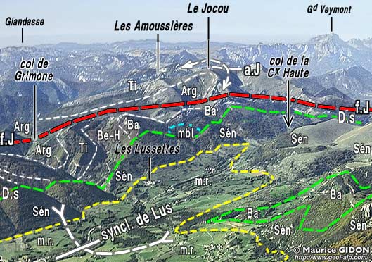 La montagne du Jocou correspond essentiellement à un anticlinal du Jocou, N-S, post-Sénonien. La voûte structurale de ce pli suit d'assez près la crête sommitale de la montagne mais, au niveau de celle-ci et sur son versant est, l'érosion a éventré le pli jusqu'à son cœur d'Argovien. Toutefois , dans les pentes orientales du Jocou, en contrebas de la crête, la retombée est de l'anticlinal est rompue par des cassures orientées peu obliquement à son axe ; elles appartiennent à l'extrémité septentrionale du faisceau de cassures de l'accident de Bonneval (voir également les pages "Toussière" et " Bonneval"). La plus importante d'entre elles est la faille du Jocou, qui joue un rôle prépondérant dans la structure du versant qui domine le col de la Croix-Haute ; au sud du col de Vente-Cul, elle se poursuit en passant sur le versant ouest de la crête jusqu'au col de Grimone avant d'y passer de nouveau (mais brièvement) en versant oriental du chaînon (voir les pages "Grimone" et "Lus").