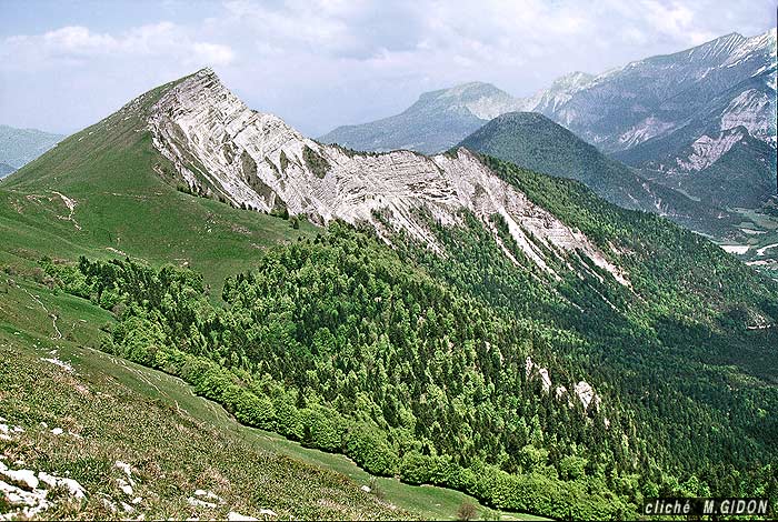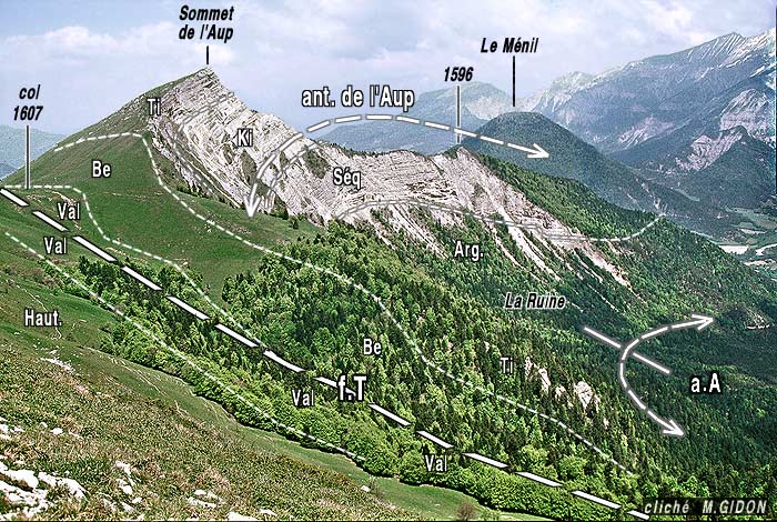 formé par la barre tithonique, à pendage vers l'ouest, qui y est découpée en chevron entre deux profonds ravins affluents de cette vallée. L'entaille de ces derniers met en évidence un anticlinal de l'Aup, d'axe