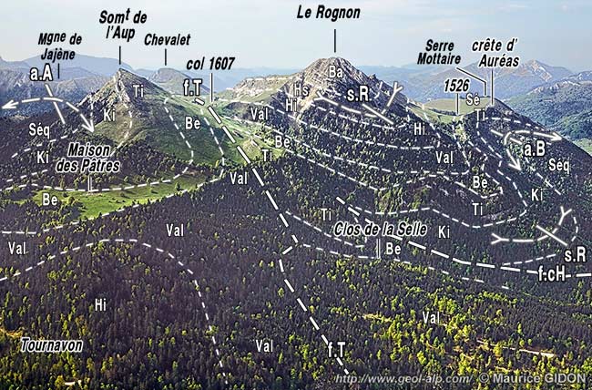 stratigraphique des couches du Néocomien semble se poursuivre vers l'ouest, en continuité, jusqu'au sommet du Rognon. En réalité ce col correspond au passage d'une faille de Tournerond, d'orientation N-S, qui court vers le sud, par le col de Tournerond (1641), jusque dans le versant ouest de la Pointe Feuillette. Elle surhausse sa lèvre orientale (portant le sommet de l'Aup) et détermine un alignement de vallonnements N-S qui sont en fait affouillés dans les marnes du Valanginien.