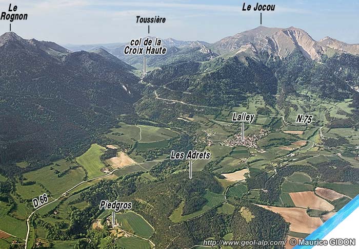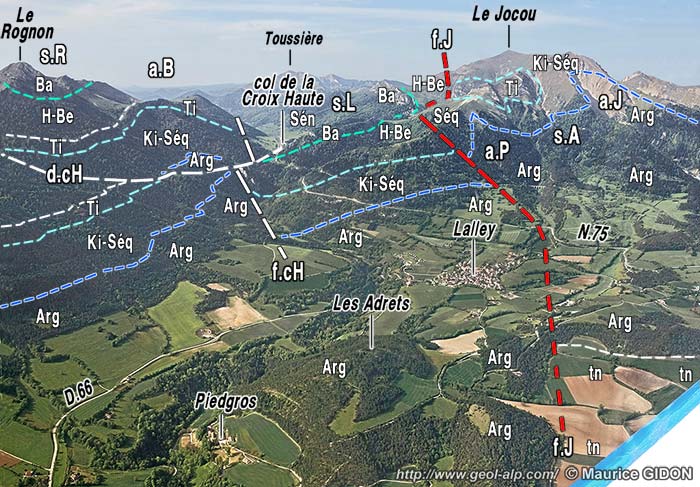 La faille de la Croix Haute se perd vers le sud à la latitude du col de la Croix-Haute, où son prolongement au sein des couches sénoniennes du flanc ouest de l'anticlinal du Boutouret (suggéré par la carte géologique Mens) est une interprétation que rien ne vient en fait étayer. En réalité il ne semble pas que son tracé se poursuive au delà de celui de la discordance du Sénonien (voir le cliché ci-après) ni qu'elle y affecte ce dernier terrain: il est donc vraisemblable qu'il s'agit d'une cassure syn-sédimentaire d'âge sénonien que cachettent les couches les plus récentes de ce dernier étage. D'autre part cette faille est sensiblement parallèle à celle du Jocou, qui passe, quant à elle, à mi-hauteur des pentes occidentales du col, mais converge avec elle vers le nord, c'est-à-dire vers le bas de la succession stratigraphique : il est donc possible qu'elles se rejoignent au sein des Terres Noires aux abords nord-orientaux de Lalley. Elle possède en outre un rejet vertical de sens inverse, de sorte que ces deux cassures délimitent entre elles un compartiment affaissé assez étroit et allongé N-S qui ressemble, à cette latitude, à un graben écrasé par serrage. Ce n'est là qu'un des nombreux exemples de plis dont la localisation est due à une fracturation antérieure. |