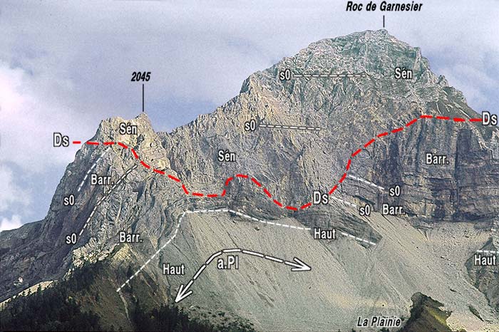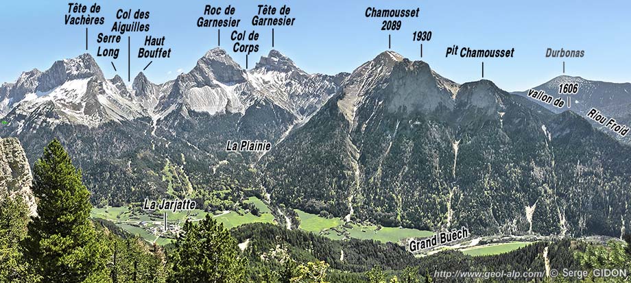 Mais à partir du sommet de Chamousset la chape sénonienne, qui reste d'ailleurs là presque accordante sur le Barrémien, s'infléchit brutalement et s'abaisse avec lui de plus de 600 m en basculant à la verticale (et même par places au delà) en direction de l'ouest. Cette très brutale inflexion des couches (que l'on pourrait appeler "flexure du Chamousset") est en fait le flanc oriental du synclinal du Chamousset - Chabottes qui nait là et qui se caractérise mieux plus au sud (page "Recours"). Ce pli, d'axe NNW-SSE (donc orthogonal à l'anticlinal de la Plainie), a la particularité d'être très déjeté vers l'ouest, au point que son flanc ouest est horizontal voire plutôt penté vers l'ouest dans la coupe du Buëch : il ne s'agit donc, en fait, que d'un repli affectant le flanc oriental du grand synclinal N-S de Lus.